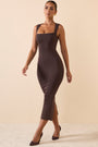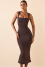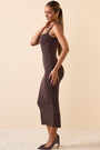 • Oh Polly's Priscilla wearing the Ainslee Midaxi Dress in Chocolate Brown Modal fabric perfect for evening cocktail parties